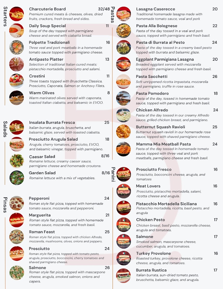 - Salads: Various salad offerings include combinations of fresh vegetables, cheeses, cured meats, nuts, and dressings, for example, Insalata Burrata Fresca and Maple Pecan Salad.