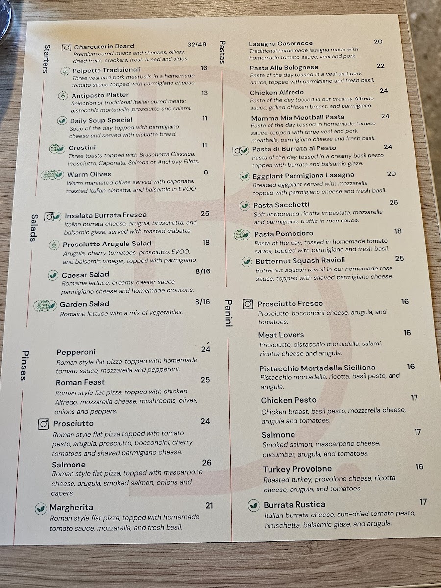 - Starters: Light appetizers including soups like Butternut Squash Soup, meat-based options such as Polpette Tradizionali (veal and pork meatballs), and charcuterie boards with a variety of cured meats, cheeses, olives, and accompaniments.
