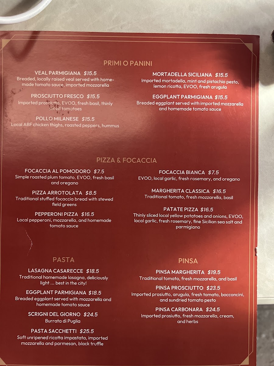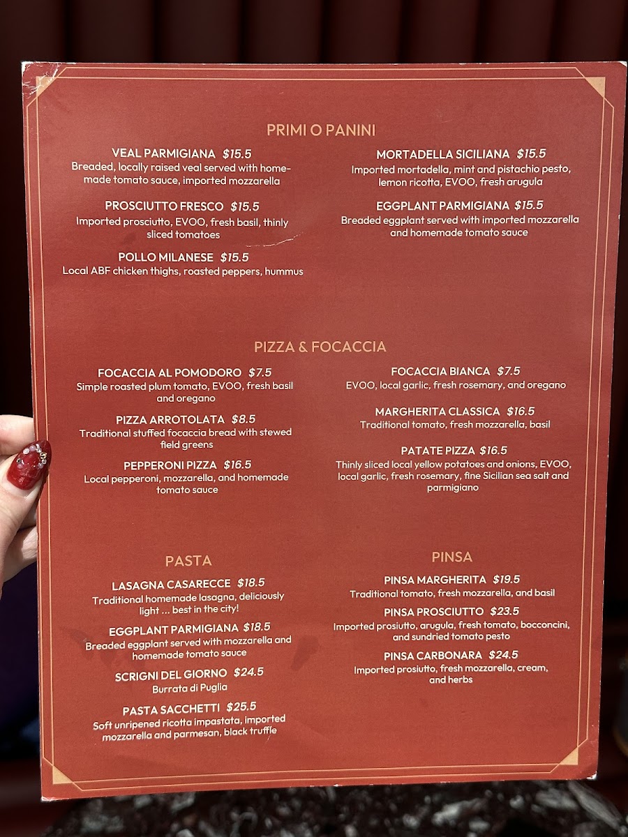 - Panini: A range of Italian-style sandwiches, such as the Veal Parmigiano Panino, featuring veal, tomato sauce, mozzarella, and parmigiano.